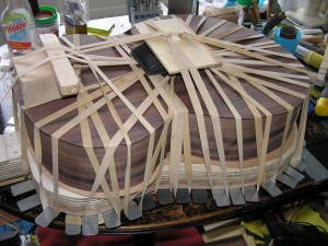 So here is the classical sound box covered in rubber bands while the glue on the back is drying.