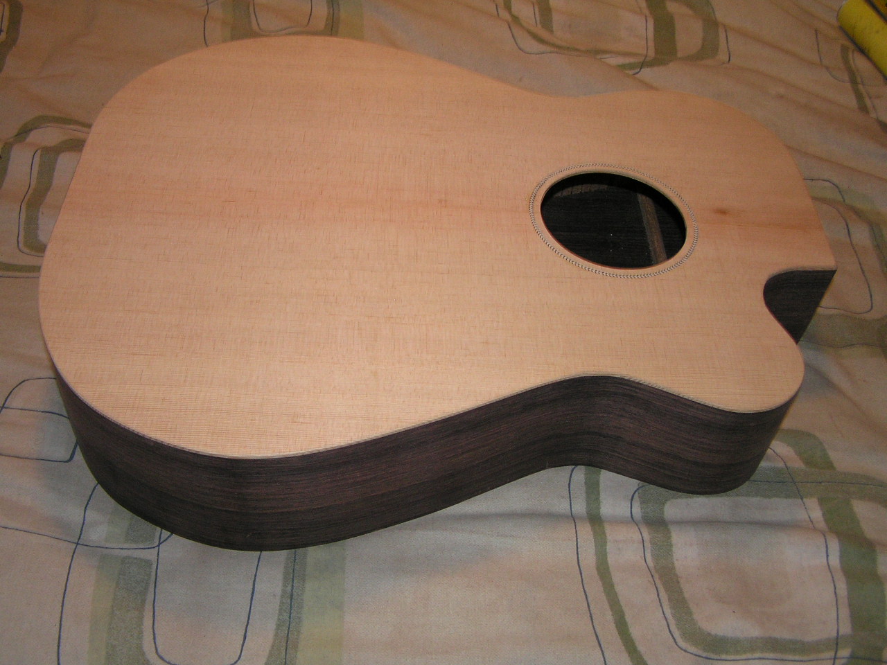 As soon as the glue has set on the CL guitar I will trim that down and give it a quick rub down. I use a spokeshave to trim but the rosewood is quite tough stuff and takes much more time than the mahogany on my first guitar took.
