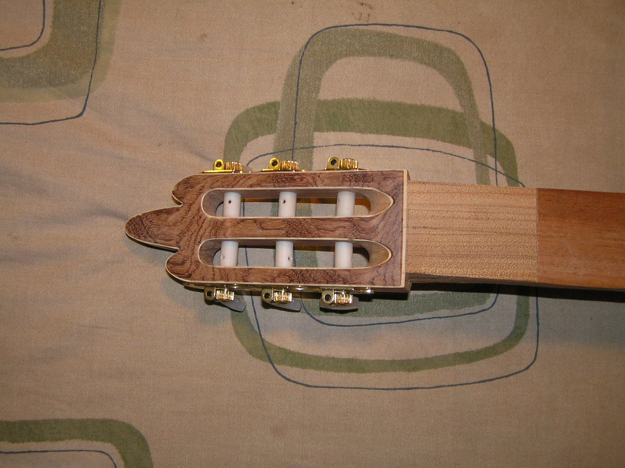The headstock has an ash veneer topped with a kevasinga veneer. The idea was to get a fine white line showing in contrast to the kevasinga and it appears to work quite nicely. fine layers of plastic would look better but I want to use wood where I can.