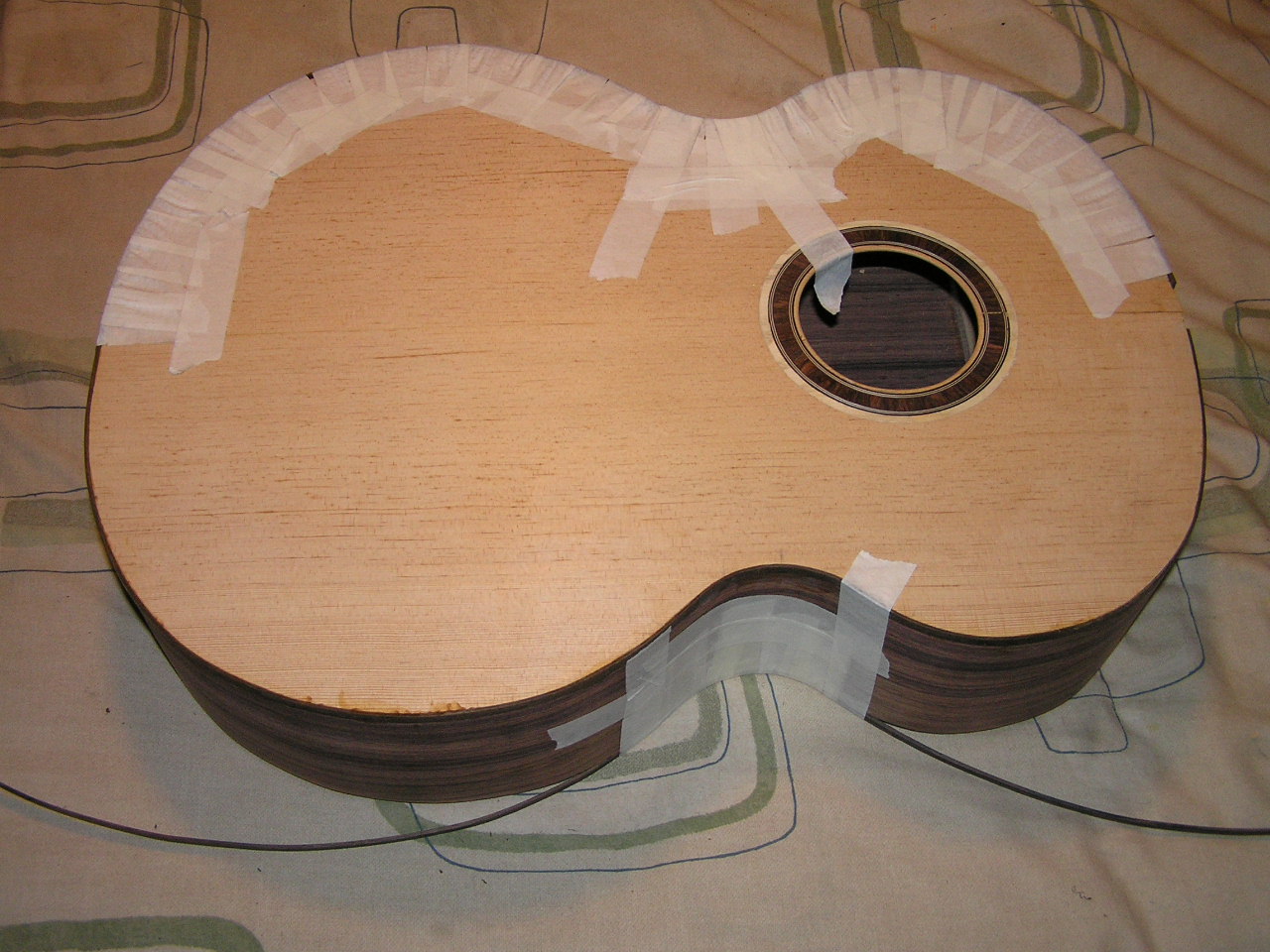 The binding is hardly noticeable when looking at the sides or back as it is only slightly darker in colour than the rosewood, of course it is very noticeable when looking at the sound board. I will not be removing the masking tape until tomorrow.