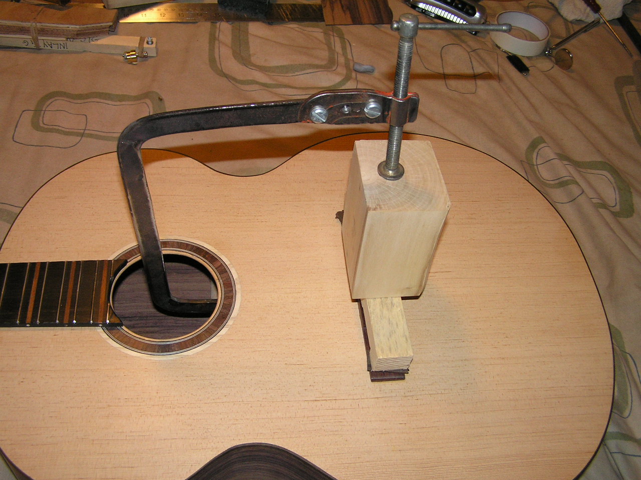 In the picture above I have a single string fitted. The bridge is not glued down and basically I was just taking a look how it was going to go and if there were any bad problems. As is turned out everything was looking okay so I glued the bridge in place.
