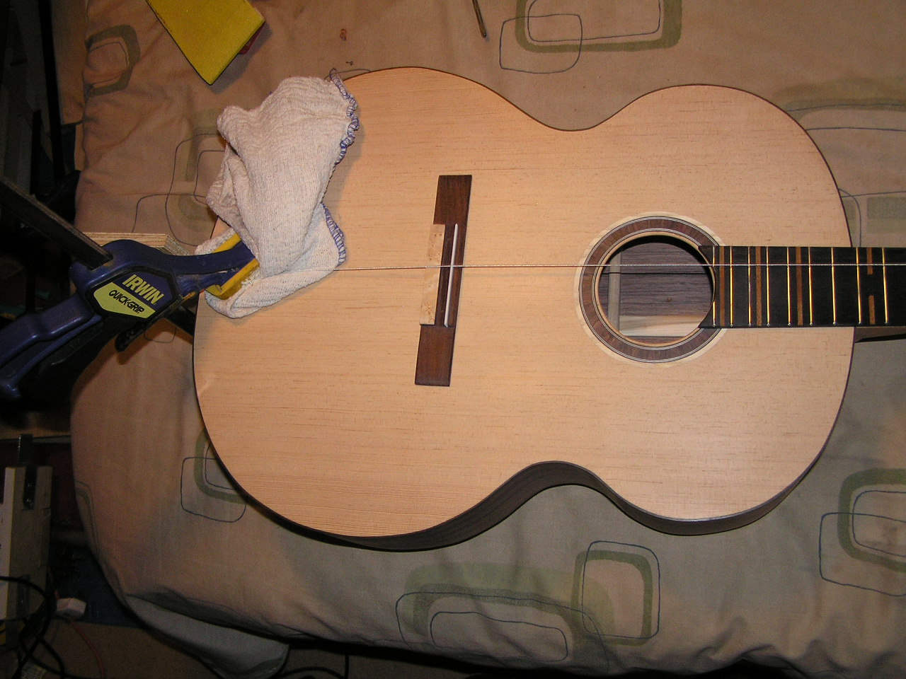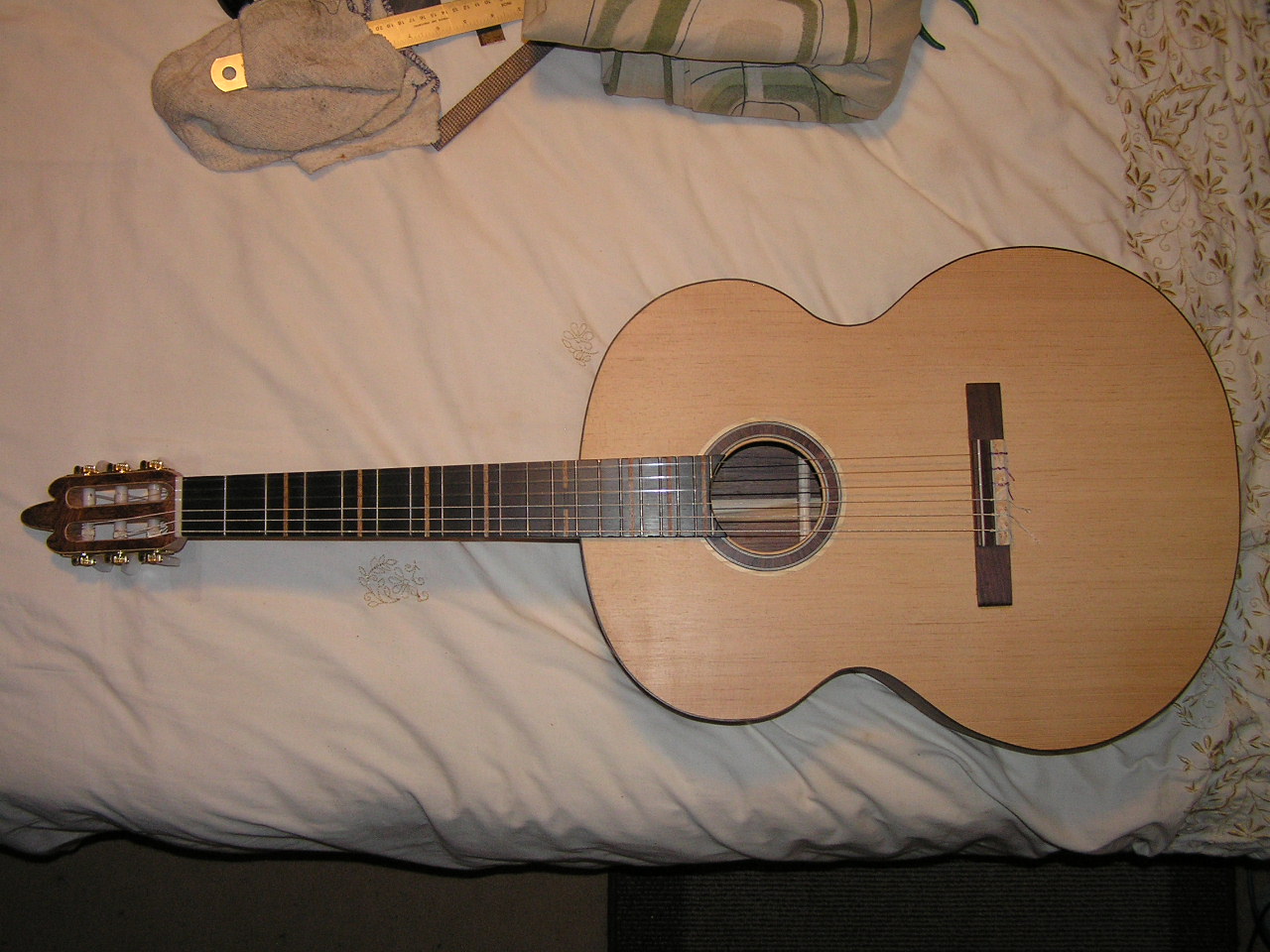 And that was all yesterday, I let the glue dry over night and first thing this morning I strung the guitar and made the nut and saddle. so now it is all together I need to get it setup properly and then rub it down lots more and wax it.