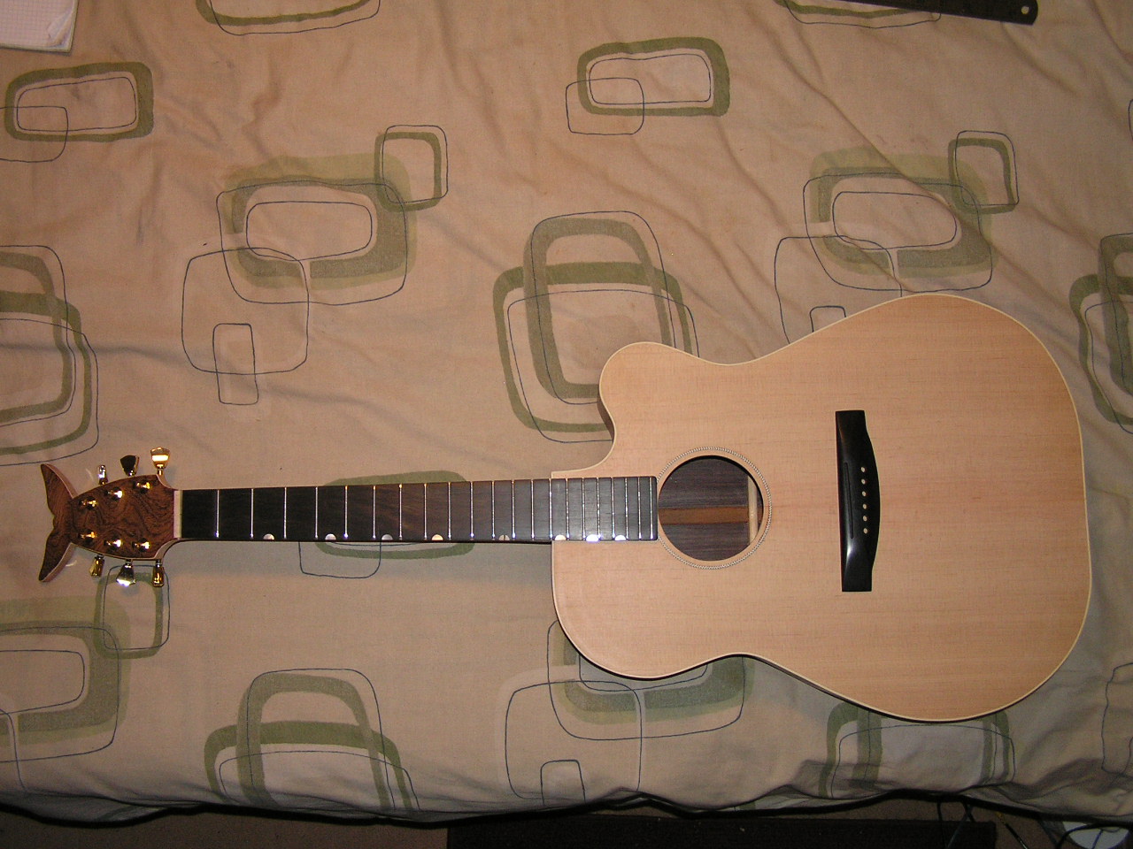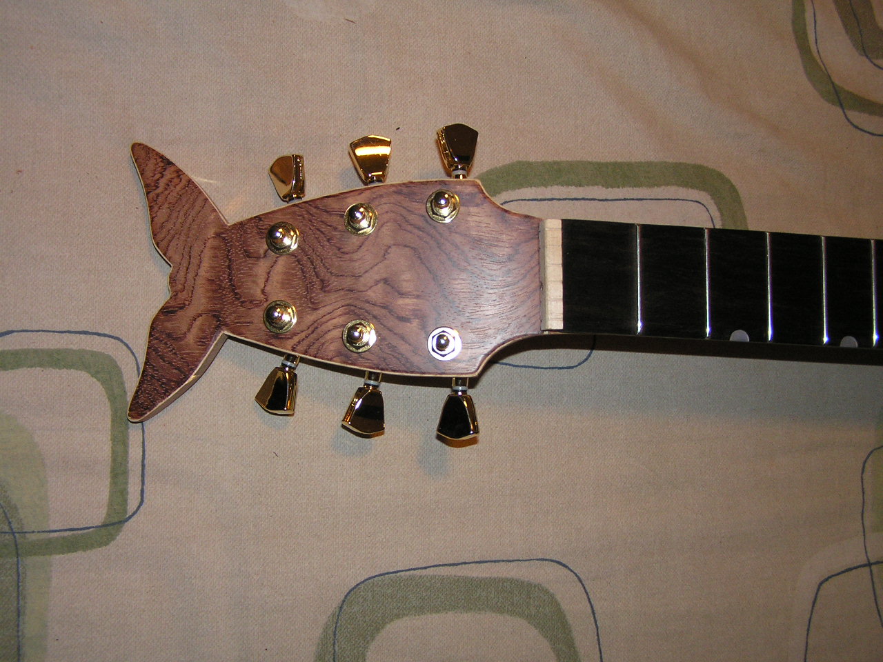 Here is what ‘The Whale’ looks like so far. The bridge is not glued on yet and the machine heads need to come back off so I can enamel the headstock.