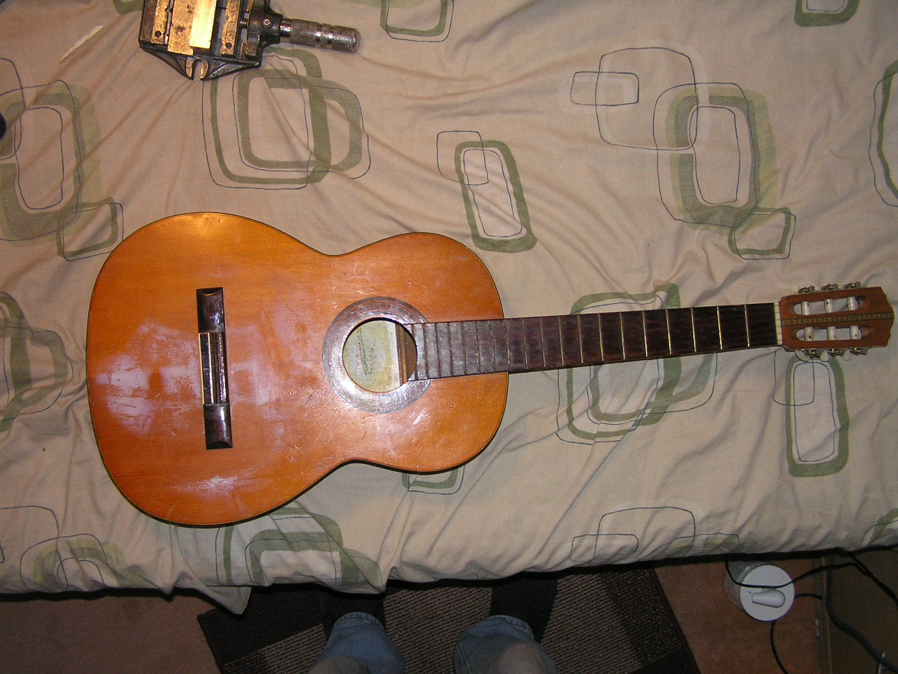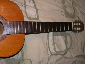 Having given this guitar a good look over it appears that it is veneered on the back, sides and soundboard. I had to go pretty carefully when rubbing down the front as it would be quite easy to go right through the veneer. I imagine that a guitar the same as this one in mint condition would be quite collectable. I have a love of guitars and personally don’t really care much about what they are worth as collectables.