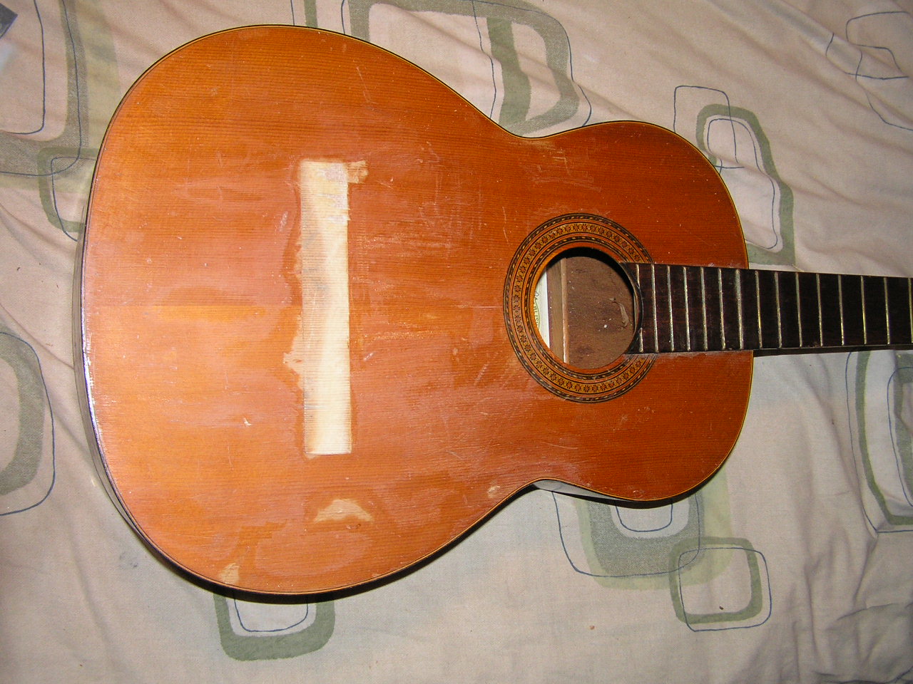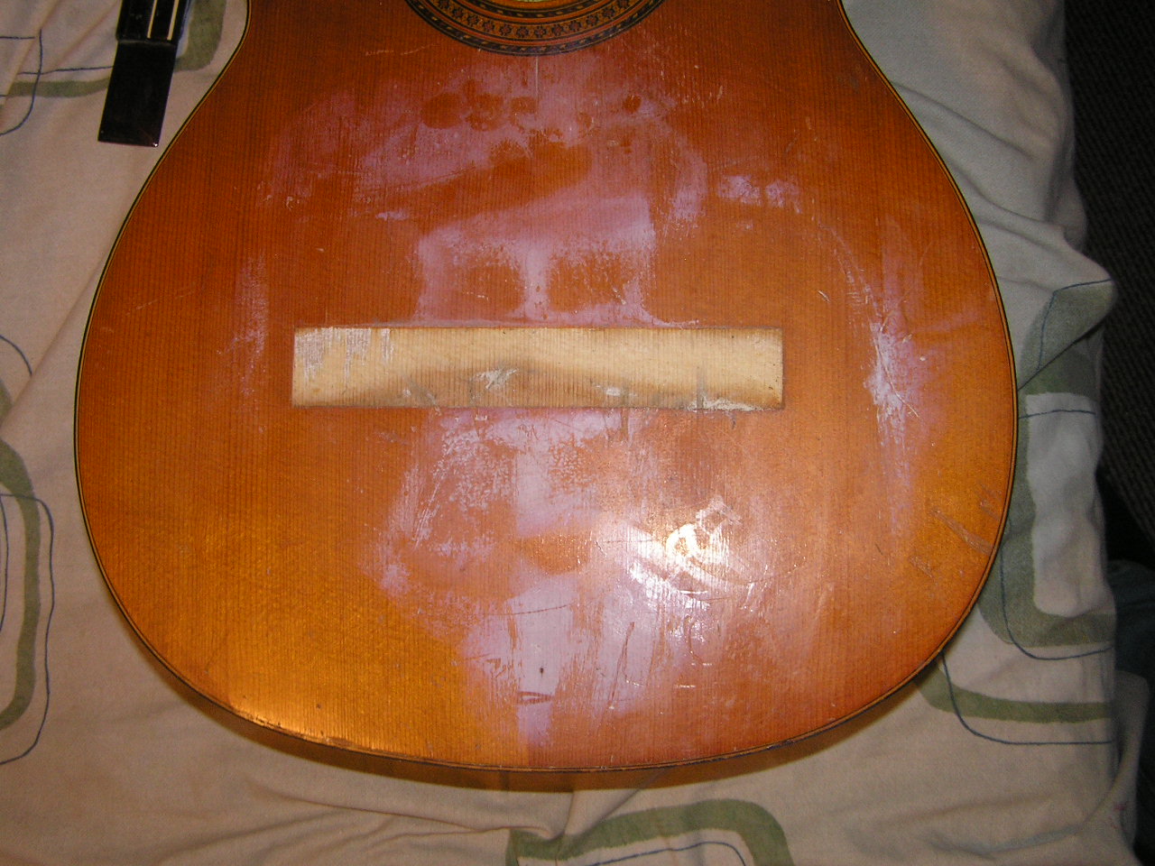 A friend of mine bought a very old (1965) classical guitar model number 1663 made by a luthier with the initials R.M for the total sum of 50 pence. The guitar had a huge hole in the area of the tail stock and a friend of my friend repaired it with what looks like glass fibre. My friend brought the guitar for me to have a look at, if I said it was in very bad shape I would be understating the condition. The strings looked like they had been tied to the bridge by some crazy man on heroin. The saddle didn’t exist at all and when I pointed this out to my friend he felt sure that it was all as it was supposed to be. On further investigation the back of the bridge was ripped completely off the soundboard. The bridge was being held on by the front 10mm of the bridge. I think that sometime in the past someone had put steel strings on it and over the time that it was strung that way it was slowly peeling the bridge off the soundboard. I must admit I found it all rather amusing and interesting at the same time, I now have a little bit of experience of what happens when a classical guitar is strung with steel strings. It is good to have the chance to learn about this kind of thing and so I offered to repair the bridge and soundboard. I am not going to renovate this guitar, I am happy to leave the repair in the sides near the tail as it is, it feels solid enough. I just wanted to make it look reasonable and improve its playability.