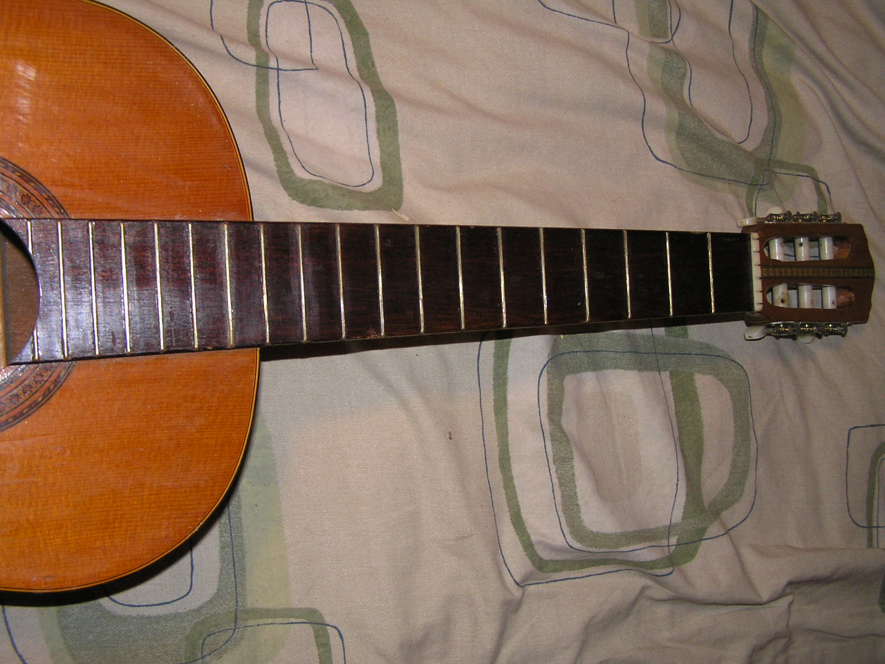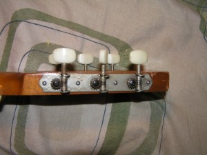The machine heads are of very poor quality and have a lot of play in them. If the guitar comes out okay then the intention is to put new machine heads on it. Also the frets from 13 to 19 inclusive have corroded, all the frets look like they are made of brass, I was going to change the frets but I don’t think I will now. I will clean up the 13 to 19 frets as best I can and the first 12 frets are not in too bad a condition and it is only the first 12 frets that are used when playing this guitar.