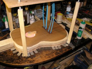 I have used a small piece of rosewood from a previous back for the bridge patch. I am basically making a copy of the old Suzuki, the big difference is that my copy is about 15mm bigger, the Suzuki does not have a bridge patch and I couldn’t decide whether to use one or not. As the picture shows I made my decision.
