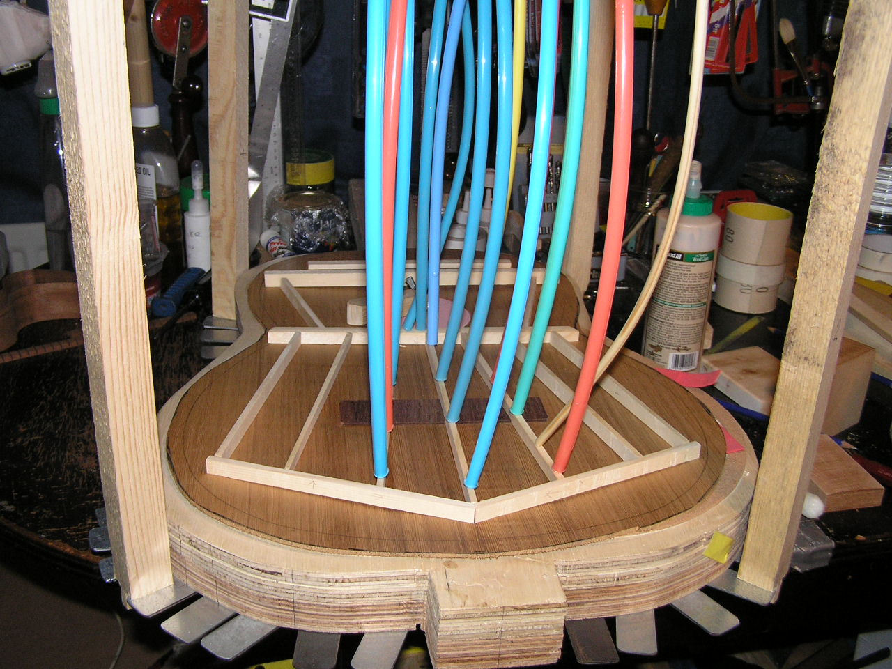 As can be seen the bracing has been cut. It seems a bit strange to me that the sizes stated for each bracing piece is quite large as compared to what remains after carving, it appears that you carve away about 75% of the wood. So I decided to cut the bracing a lot less than suggested, I will only be carving about 25% away.
