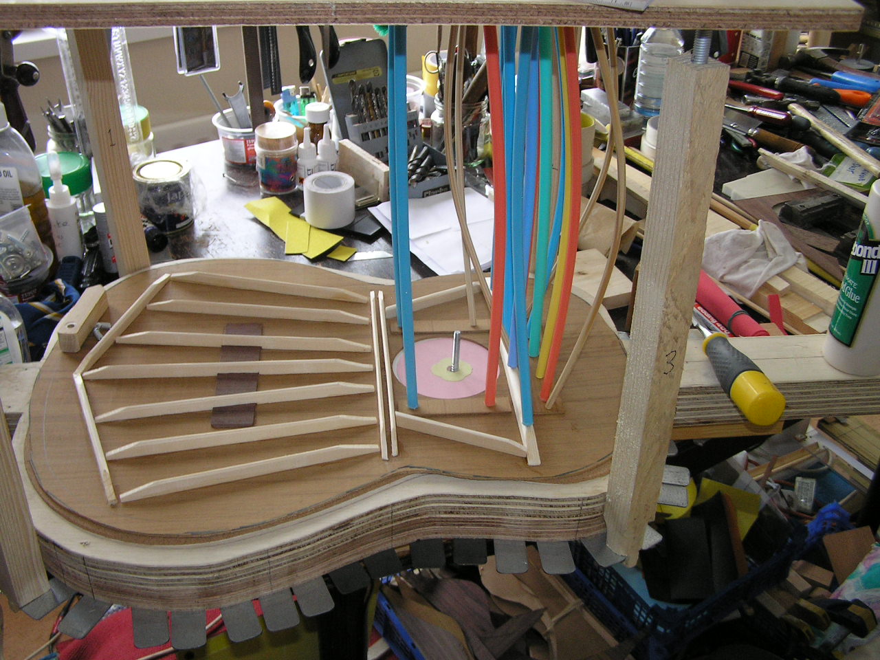 I have completed the bracing on the soundboard. I have used the available spruce from the leftovers of build 2 & 3. I have put the bracing in the common fan layout, making a few deviations from the standard model. No, I do not have any idea about what it will do or how it will change the sound, this is just an experiment, it may sound great, okay or crap, whatever happens I will learn something.