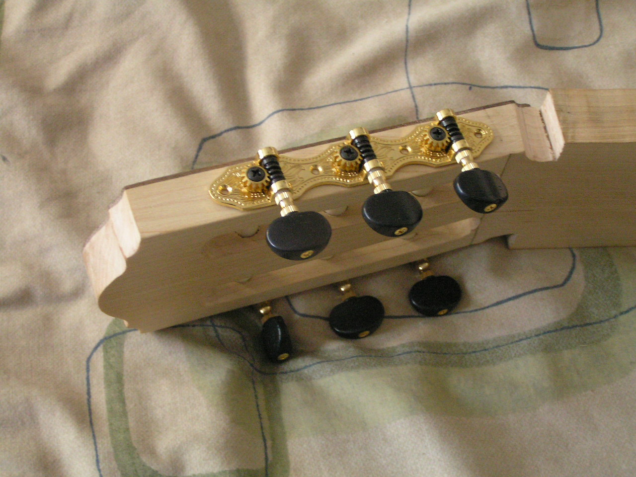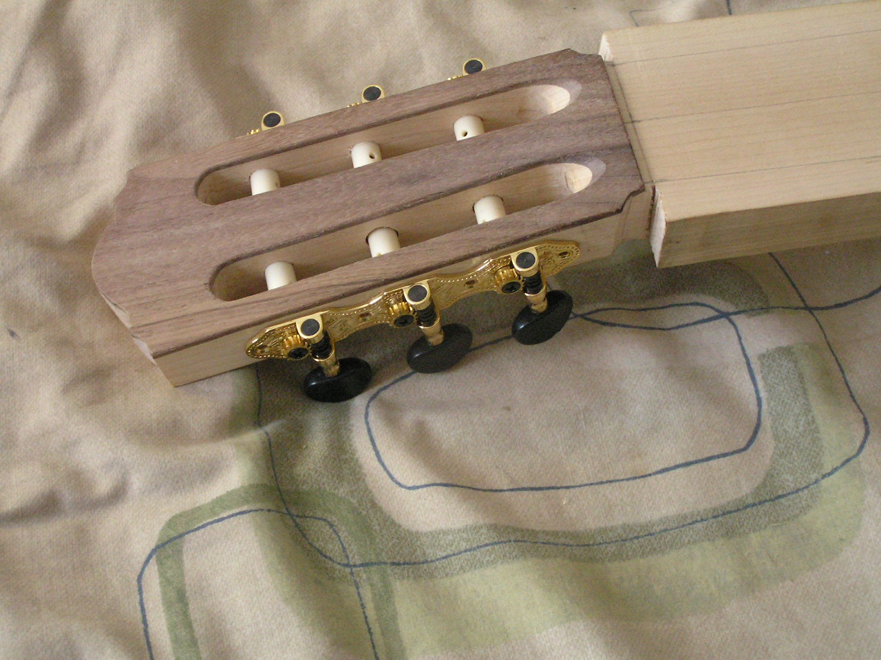 I am waiting for the delivery of the rosette I bought for this guitar, so I am getting other things done while waiting. I needed a method of drilling the 10mm holes in the classical style headstock. My solution can be seen in the pictures below, it works really well and allows me to drill the holes with my hand drill. I made this jig to be screwed to the headstock while drilling, I didn’t want the problem of the clamp slipping. The two small blind holes that the screws make are hidden by the machine heads when done.