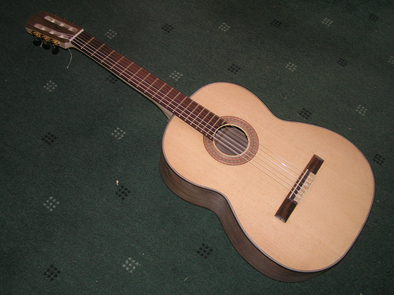 I have taken the action down considerably and it is nice and easy to play. The error I made when fitting the fret board doesn’t seem to have caused any problems at all. There is no buzzing at any position on the fret board so I have not surfaced the frets with my stone as I usually would. It just plays well and sound nice. Here are a couple of pics.