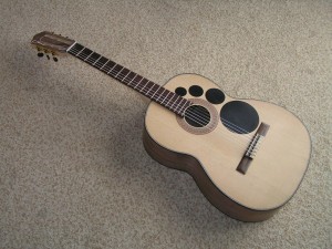 For the initial setup I have fitted a cheap set of strings and I have been playing it for a good 5 or 6 hours now, it is far too early to hear what it really sounds like, I think after a few days it will improve and after a few weeks it will hopefully sound excellent. The fact that the fret board does not reach right up to the sound hole is deliberate, personally I think having the fret board reaching right up to the sound hole is horrid, it just doesn’t look nice to me. I am going to be making a good few of these guitars and all of them will look like this one but about 20mm shorter. The size of this guitar will be a unique feature that is not repeated in all the others I make.