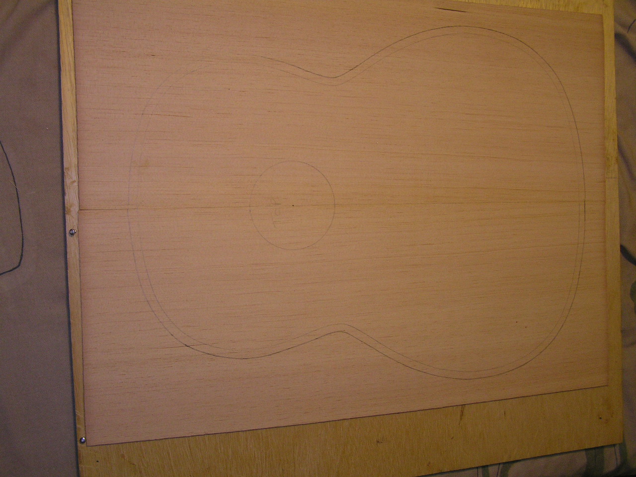 I have marked the guitar shape and also an oversize marking at 8mm outside the actual shape, this is the line I will cut the soundboard at initially. This is as much as I can get done today. The next job is the rosette followed by the bracing. I am going to keep a track of how many days the build takes. Not consecutive days as I can not work on it every day. So far it has taken me half a day to bend the sides and one day to reduce the soundboard and glue it.