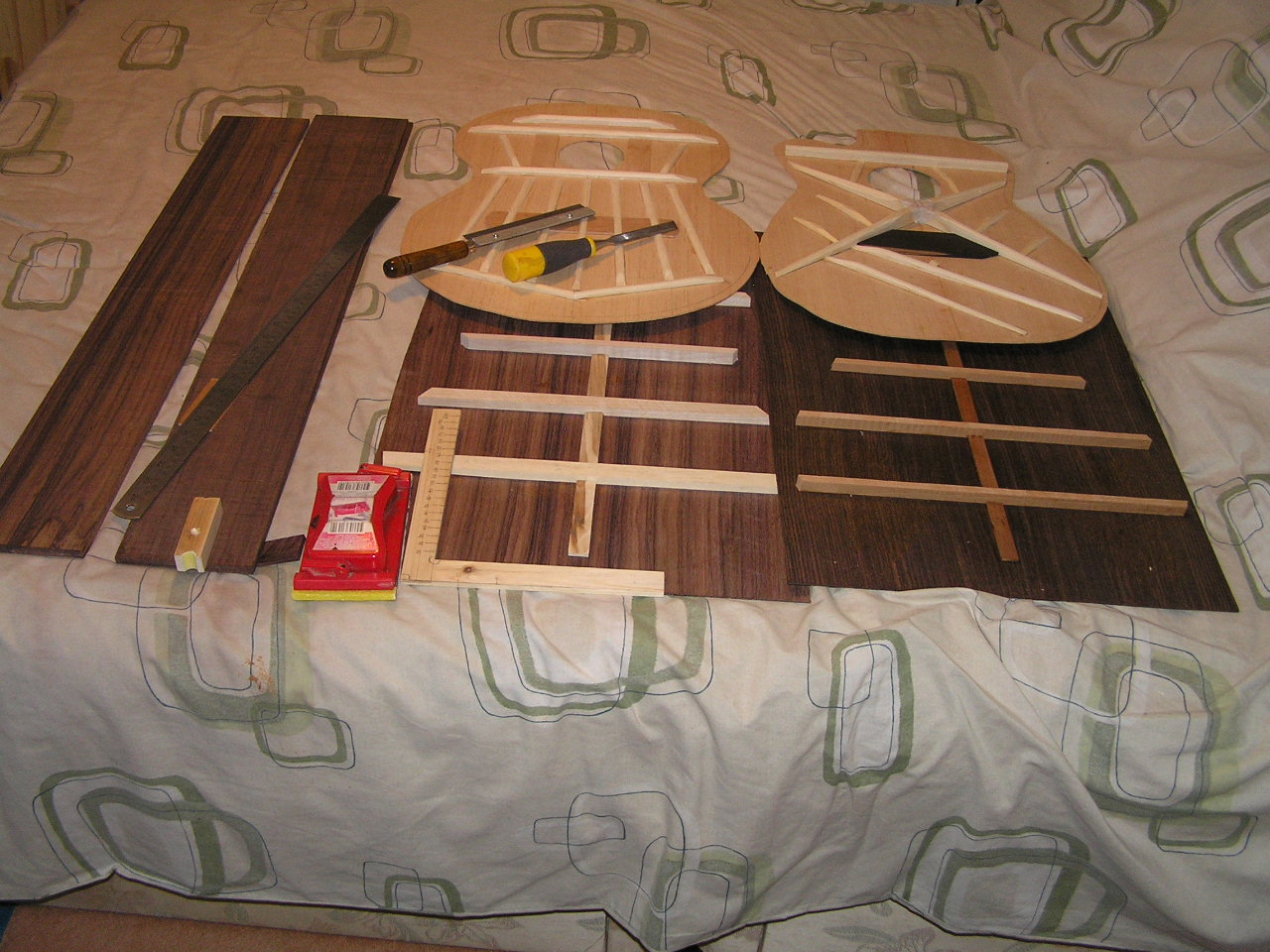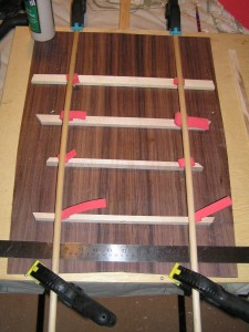 I have been doing the bracing and reducing the sides to the right thickness. Rosewood is very hard and makes reducing them with a sander very slow work. I have managed to glue all the bracing into place but still have lots of carving and sanding to do.