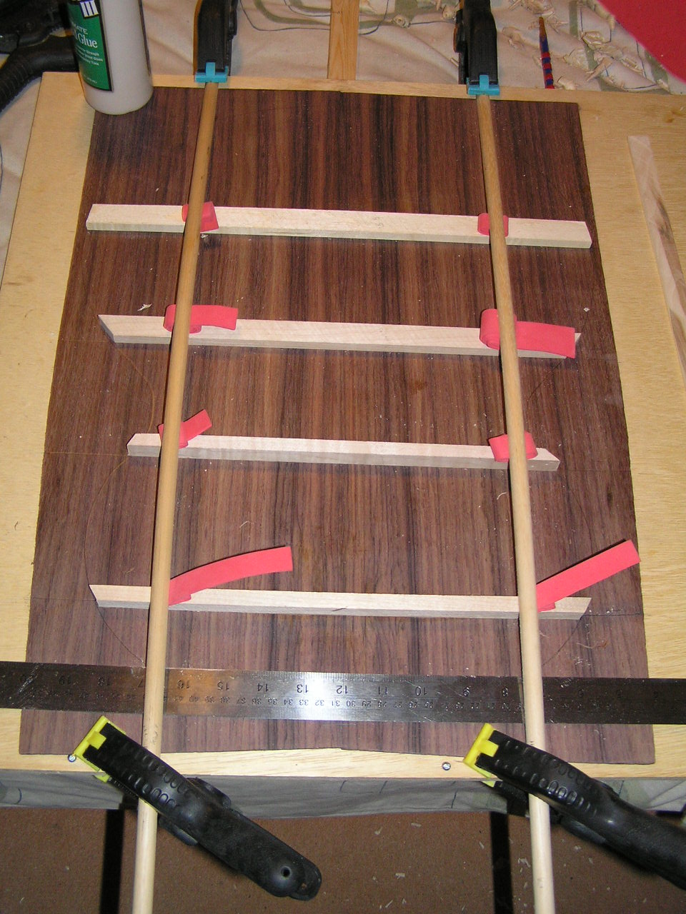 I do like to experiment with new ideas as often as I can. I tried a new idea of using bowed lengths of wood and foam fillers to hold down the bracing on the back while the glue dried. It does hold the bracing down very tight. The foam was cut into strips and then you just roll a strip until it has the required thickness to pack between the bracing and the wood bow. As in this picture.