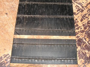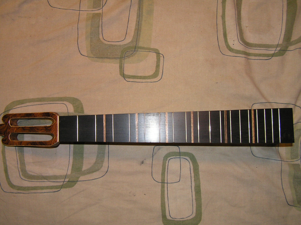 Here you can see the tack tapped onto a piece of mahogany that is sandwiched between ebony. This is actually the old fretboard from the classical guitar I made. I have tapped it down on just the mahogany, not the ebony.