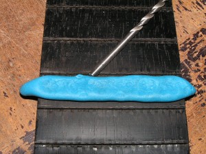 Unlike blu-tack this stuff is really quite hard at room temperature, it is this quality of the stuff that I thought would be useful. If you warm the stuff up a bit on a radiator it gets pretty sticky. Best to place it on a bit of baking foil first as it can be difficult to get it off the radiator, as I found out. While it is sticky you can apply it to the affected wood, tap it onto the wood with a 3mm drill bit end, that is because we need the extra lbs per square inch that the drill bit has over our chunky fingers. This will press it well into any surface grooves where the black dust is.