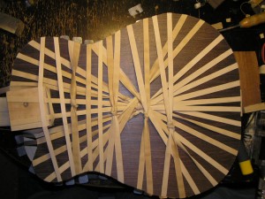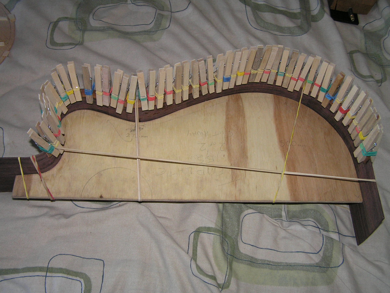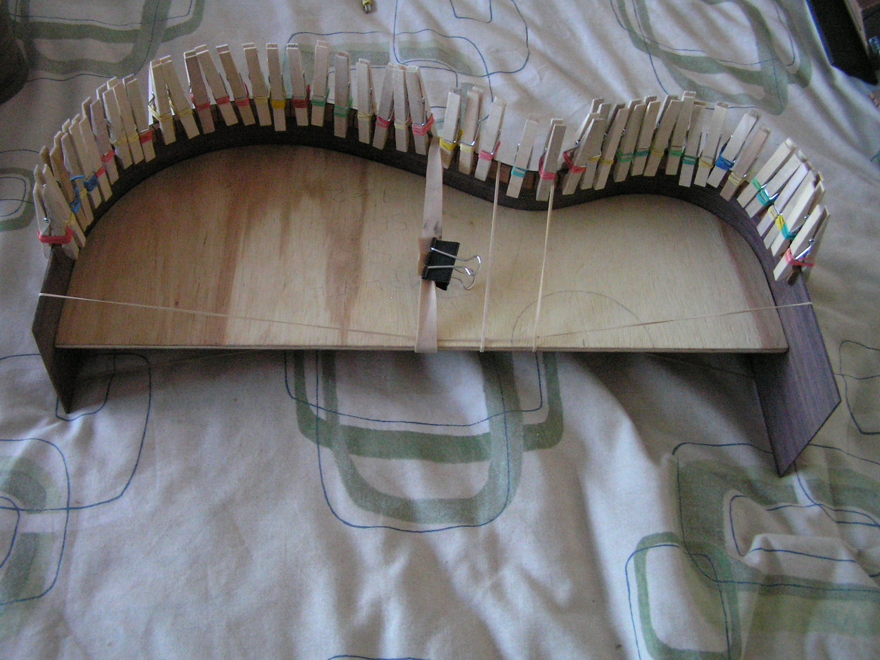 So here is the classical sound box covered in rubber bands while the glue on the back is drying.